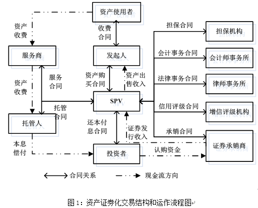 资产证券化作为一种新型的金融工具,具有比传统融资方式更为经济的优点,但其交易的组织结构也要复杂得多,一般来说,资产证券化运作中所涉及的主要参与者包括:发起人、财务顾问、特殊目的载体(SPV)、承销商、信用增级机构、信用评级机构、律师事务所、会计师事务所、评估机构、服务商、托管人、投资者等。图1是资产证券化的交易结构和运作流程图。