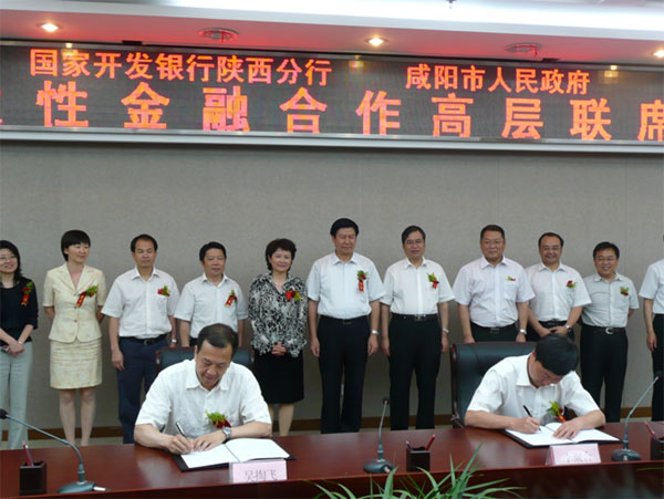 2009年6月9日下午,市政府与国家开发银行陕西省分行在市委举行开发性金融合作高层联席会议。双方签署新一轮战略合作《备忘录》,标志着咸阳市与国家开发银行陕西省分行的合作提升到了一个新的层面。国家开发银行陕西省分行行长黄俊,市长庄长兴,国家开发银行陕西省分行副行长吴掏飞,市委常委、常务副市长赵润民,副市长李聚合,咸阳城投集团董事长李忠平等参加会议并出席签约仪式。