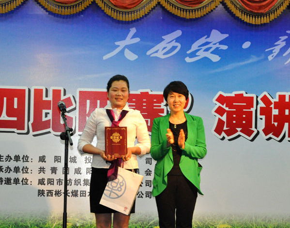 共青团咸阳市委书记林梅(右一)为一等奖获得者陈艳玲颁奖