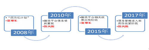 从中央政府出台的有关融资平台的政策可以看出在2008年、2010年、2015年和2017年,相关政策发生了比较大的转向。