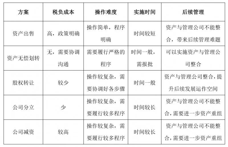 结合平台公司资产剥离的特殊背景及五种资产剥离方式的优劣势,国有资产无偿划转为首选方案,此外可适当结合股权转让、公司分立、公司减资等方案,进行综合方案实施运作,最终达到操作便利、时间短、税负成本低及便于后续管理等多种目的。