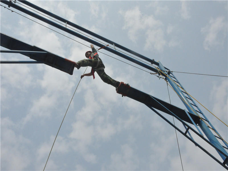 断桥高8米,宽0.3米,断口1.2米。摇晃的断桥与内心的不安此起彼伏,有人闲庭信步,有人惊慌失措,但无一人畏缩不前,“断桥一小步,人生一大步”。跨越断桥项目磨练意志品质,克服心理恐惧,培养勇于进取,勇于创新的素质。每一个攀登的阶梯,每一个来回的跨越,都源于参训者敢于自我挑战、自我突破的勇气,深刻体悟成功与失败永远只差关键的一步。