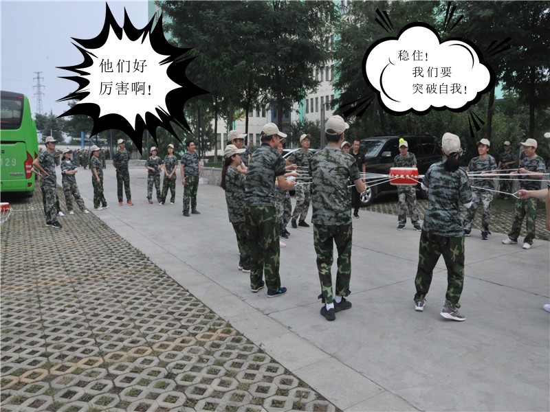 一面鼓,数根绳。绳绳联动,鼓面平平。大家团结一心,紧盯跳球,统筹联动,步调一致,通过合理准确的预估预判力求形成动态平衡。通过短暂的训练,有的队伍成绩上不了30次,而有的队伍突破了150次。简单的游戏蕴含了颇深的团队建设道理。
