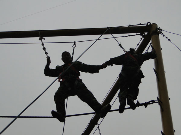 在那八米高的高空断桥项目中,大家第一次感受到团队的手臂有力和必要。每个人都尝试着走出自我,真正挑战自己,打破思想禁锢。尤其是在双人钢索项目中,我们不得不感叹这发源于海军陆战队的训练项目,对现代企业文化管理的深远意义,没有协作,你将寸步难移,凝视伙伴的双眼,给你自信,伸出你的手臂,我们一起通向彼岸……