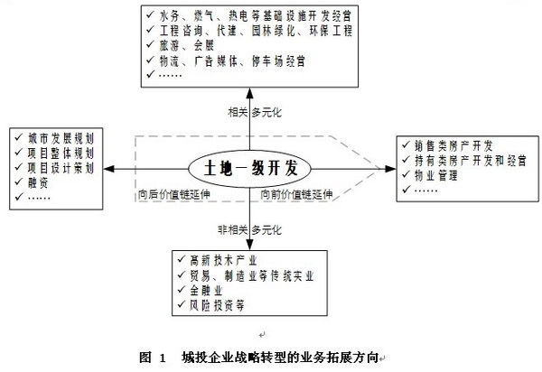 从目前国内已经成功转型的城投公司的业务拓展路径来看,大多是业务都是沿着土地一级开发价值链(如图1)进行纵向的前后向延伸以及相关多元化发展而来。也有部分企业凭借其独到的资源、机遇和雄厚的实力进行非相关多元化的拓展,取得了良好的效果,但大多是企业所进行的非相关多元化尝试都不太成功,最后还是以土地开发价值链领域为主。