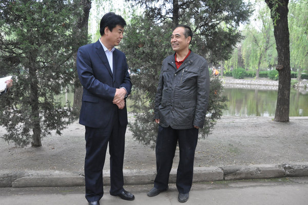 惠市长(图左)走访垃圾清运工人张存良征求意见