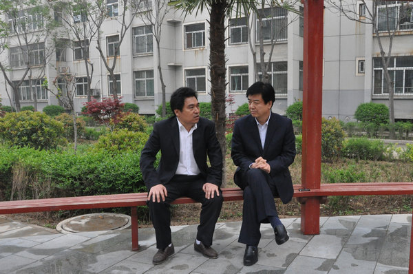 惠市长(图右)与河南街小区物业公司负责人赵明海促膝交谈征求意见