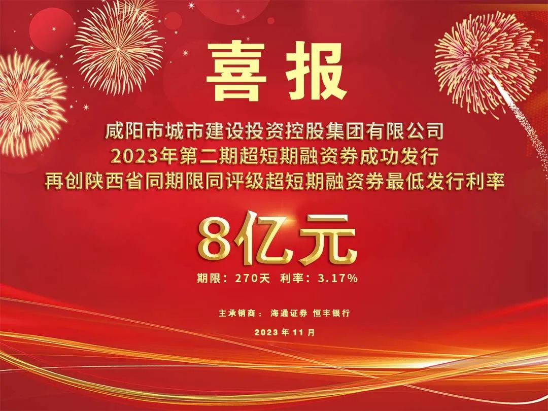 喜报!咸阳市城投集团2023年第二期超短期融资券8亿元再创利率新低