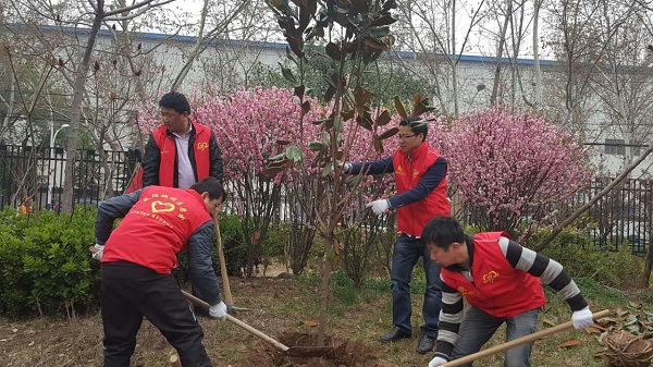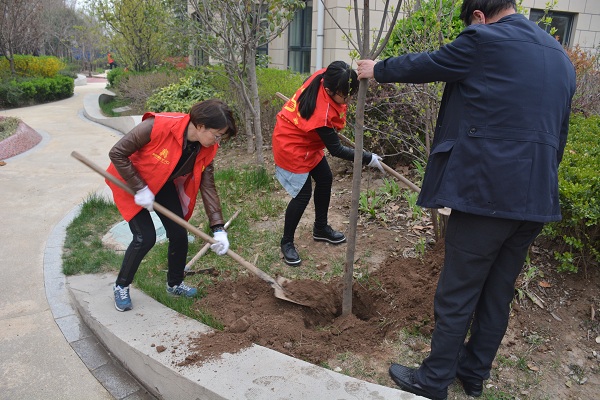 党支部书记王晓芳身先士卒,鼓舞大家积极参与。志愿者纷纷热情高涨、铲土填坑、挥锹培土、夯实土层、节水灌溉。现场一片欢笑声,处处都是志愿者忙碌的身影,在近两个小时的活动中,共树植15棵。