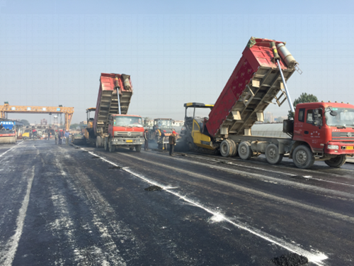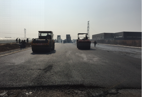 11月2日,咸阳高新区高科三路项目施工现场运输车、摊铺机、压路机一字排开,伴随着巨大的轰鸣声,数台机械来回作业,顿觉热浪袭人。施工路面逐渐变成黝黑的颜色,在施工现场经理刘永波告诉我们:“高科三路K1+672至K1+930段道路的沥青油石铺设预计当日便可完工”,这标志着高科三路已圆满完成铺油任务。