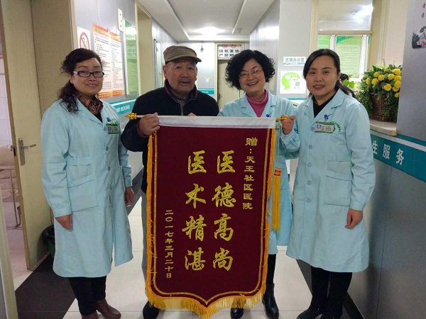 3月28日一大早,城投医疗集团天王医院住院部医生办公室,已80岁高领的患者张道伦,用颤抖的双手将一面锦旗交到了医生张美红手里,还不停地念叨着,“多亏张大夫救了我的命,感谢医护人员对我的精心护理……”