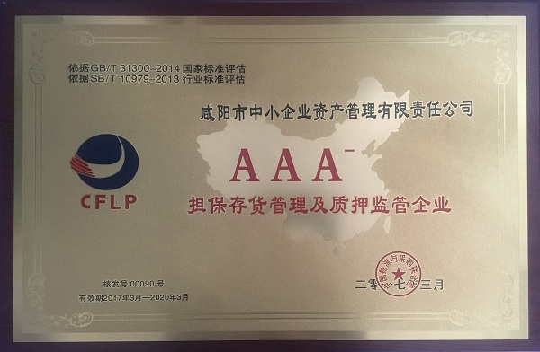 4月7日,在昆明召开的2017年度物流企业授牌大会上,咸阳市中小企业资产管理公司被中国物流与采购联合会授予担保存货管理及质押监管企业AAA-级认证。标志着公司的存货质押监管业务被国家权威部门认定为最高级别,使公司完成了由仅服务于担保公司向全市金融机构提供中小企业资产质押监管服务的转变,大大提升了公司的核心竞争力。