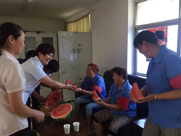 当日上午,总经理赵明海、工会主席常红艳等一行来到河南街、安谷苑、九冶、城投时代进行慰问,向一线职工送去800余斤西瓜。慰问组每到一处,都详细询问保洁、保安人员的生活情况和工作状况,叮嘱他们要注意防暑降温。并转达了集团公司对他们的关心,叮嘱他们在“创文”攻坚工作中,一定要做好遮阳降温等保护措施,注意劳逸结合,预防中暑。