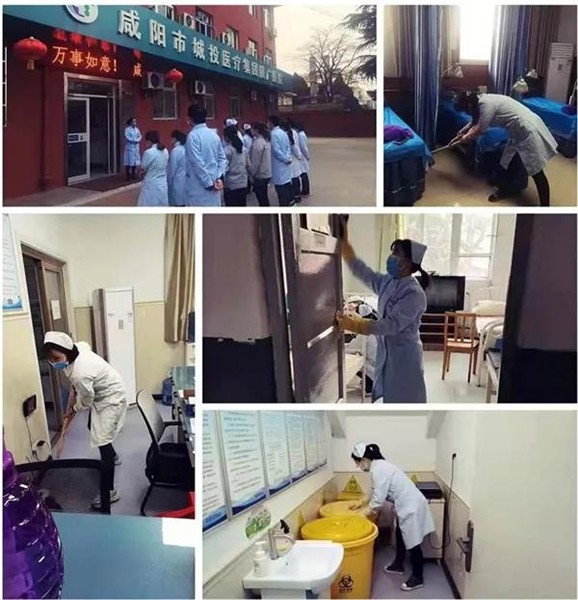 医务人员仔细对院内进行消杀
