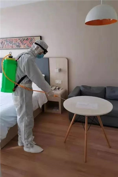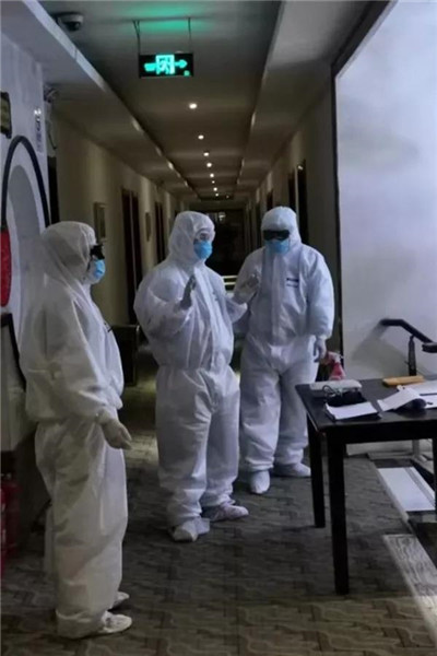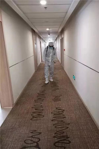 2月3日,第三批1名密切接触者入住。根据工作要求,只要有新入住人员,就必须立即对全区域进行消杀。15升消毒水2000平米全区域消杀面积,虽然才入驻两天,却成为突击队员的“熟练动作”。在完成安置入住人员,完成全区域消杀后,一个让所有队员松一口气的消息传来,前一天发热的入住人员已经体温正常了,并且其他入住人员各项指标也没有出现异常。