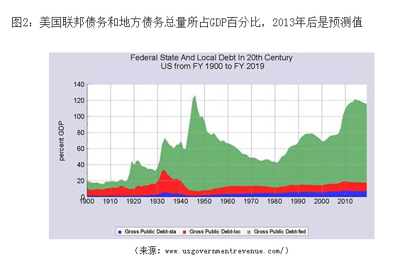 美国地方债务分为州(State)和县市(英文为Local,本应该指的是州以下级别,为了研究和理解方便,暂且称为地方)两个级别。美国地方债务所占全国GDP的比例比较小,约为总债务量的1/6。截至2013年,美国州政府负债约为1.16万亿美元,市政府负债约为1.85万亿美元,总计约3.01万亿美元,分别占GDP约6.90%,10.98%,合计约17.88%,而中国大陆地方债务约占GDP的32%。